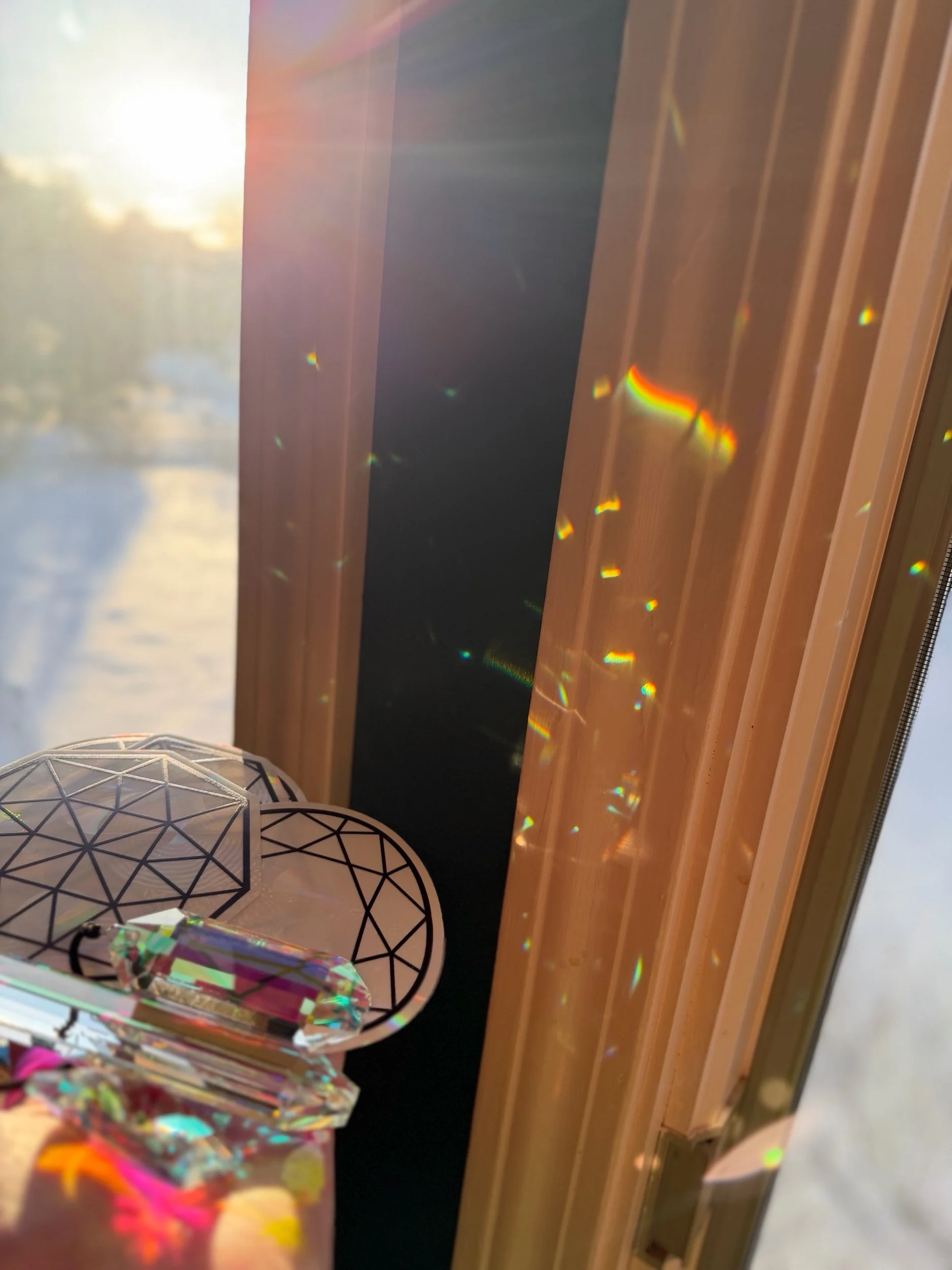 Each painting comes with a interactive sensory kit that includes a UV flashlight, a light refracting glass prism, a Rainbow Symphony light refracting window decal and other surprise items to interact with your painting in the light and the dark. **Last photo shows how the crystal and decal will interact with what is on the wall in direct sunlight, use them to interact with your painting in different lighting and/or hang the art in a space that catches the light refractions..